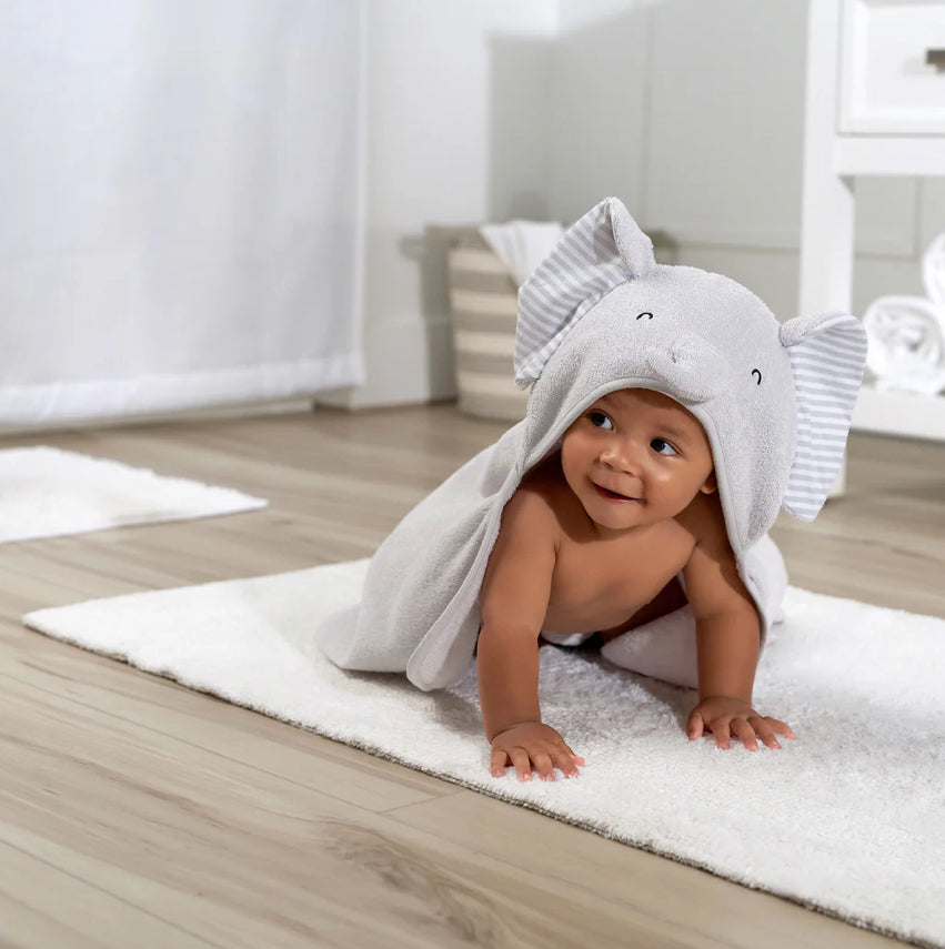 This charming baby towel featuring an adorable elephant hood is the perfect way to wrap your little one up all cozy and warm after bath time! Crafted from soft and cozy cotton woven terry, the delightful elephant face towel adds a touch of fun to the bath time routine. And for gentle cleaning, this set includes three super soft washcloths made from a cotton and polyester knit terry. Our essentials have been independently certified with STANDARD 100 by OEKO-TEX® so that you don’t have to worry about harmful substances in your baby’s wardrobe. This pack includes one towel and three washcloths. Towel measures 26" x 30". Washcloths measure 9" x 9".