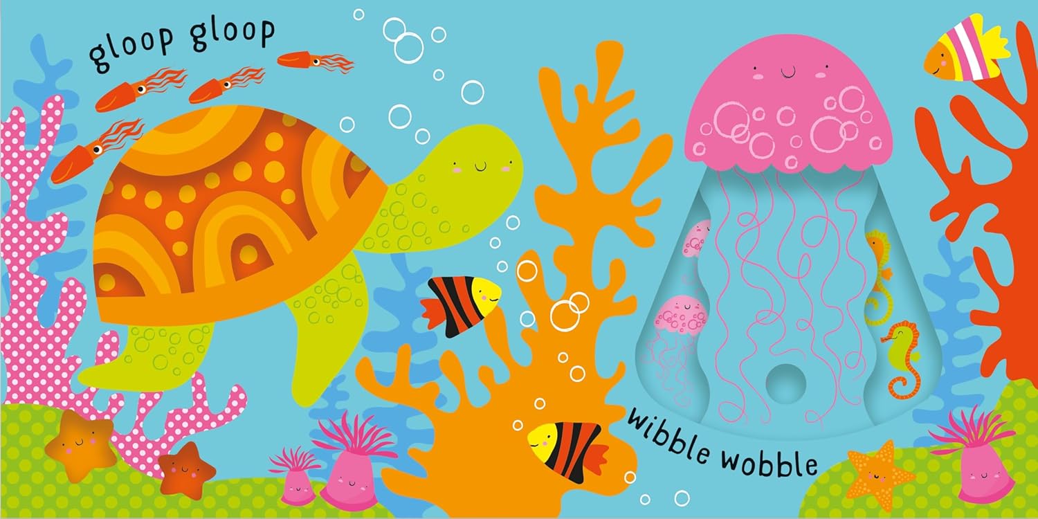 An engaging, interactive board book, specially designed for very young children, full of vivid colours, sliding panels and friendly sea creatures. Babies will love moving the sliders to see a group of playful seals swim around or a hermit crab peep out from its shell. A joy to share with any baby or toddler.