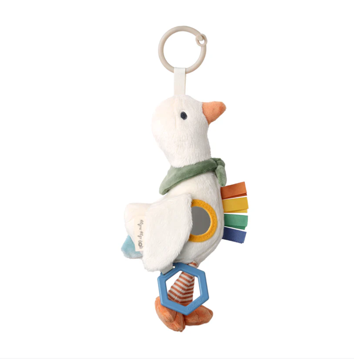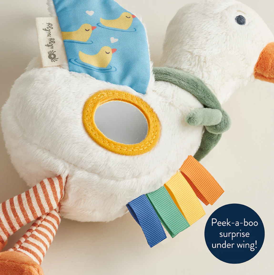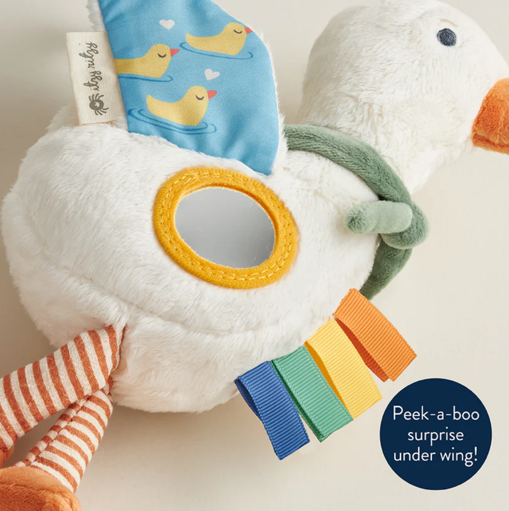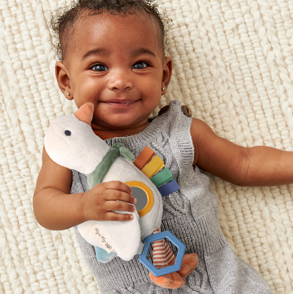 Cuddle, play & learn! Your little one’s new exploratory tagalong! The attachable Bitzy Traveler™ is made with minky velour and features jingle sounds, a dangling ring, crinkle textures, a peek-a-boo wing and more!