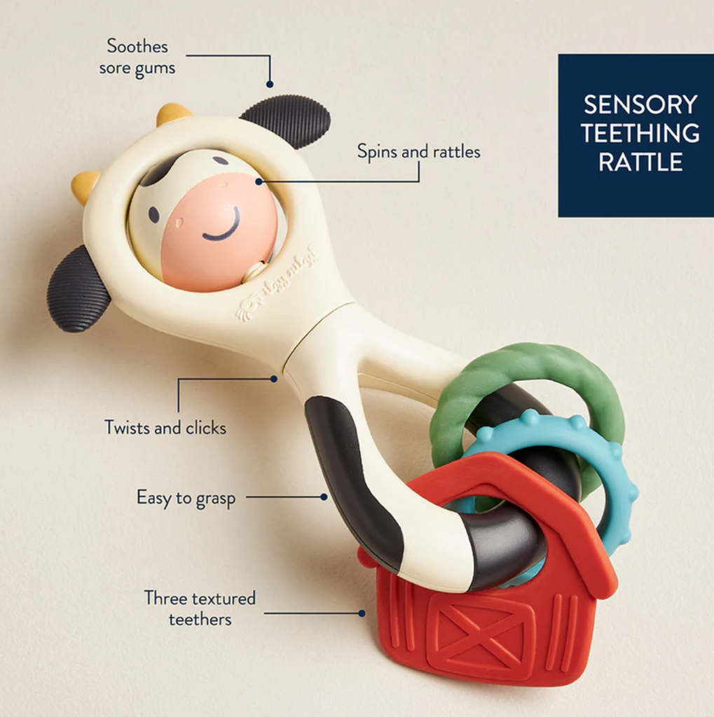 A sensory sensation for your little one! The Itzy Spinner™ is a sensory toy and teether all-in-one. Gentle rattle sounds and a spinning face are sure to captivate. The easy-grip handle turns and clicks keeping tiny hands busy. Soft ears and three clinking rings are textured to provide relief to sore gums. An all-purpose companion for your little adventurer!