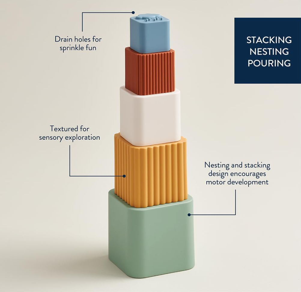 - BOOSTS HAND-EYE COORDINATION: This set of 5 stacking cups support fine motor skills and interactive play by encouraging little hands to stack, balance, and explore.