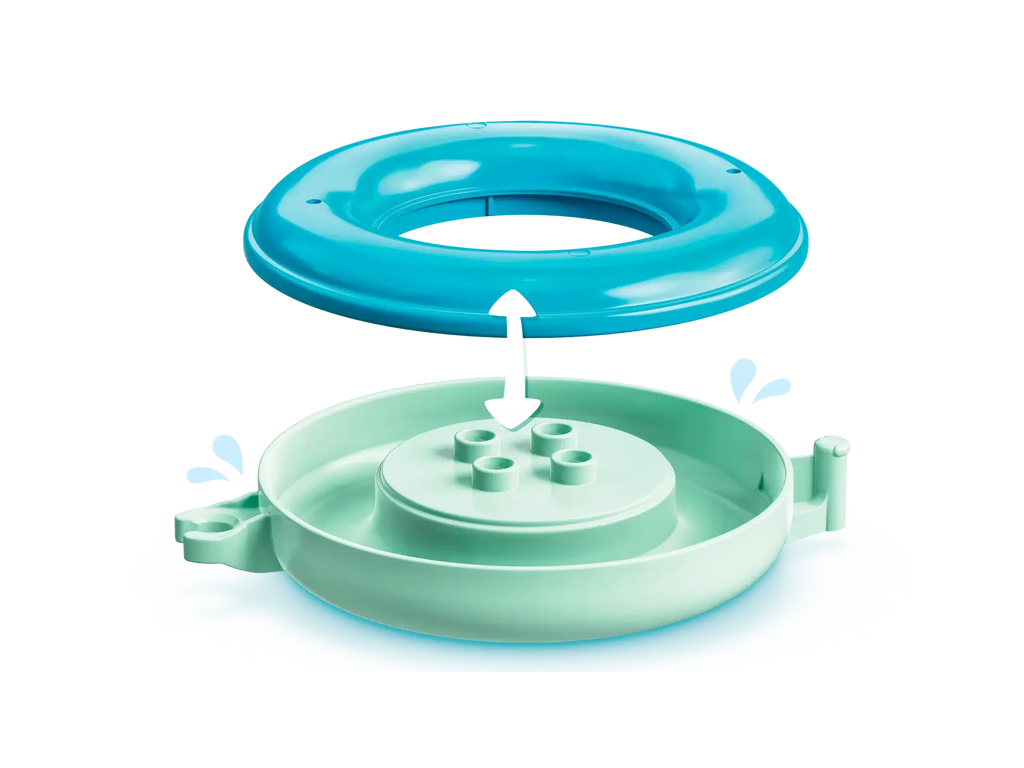 Toddlers build and learn as they pour and splash, with 3 animals in floating rings, a bucket and a cloud that rains
