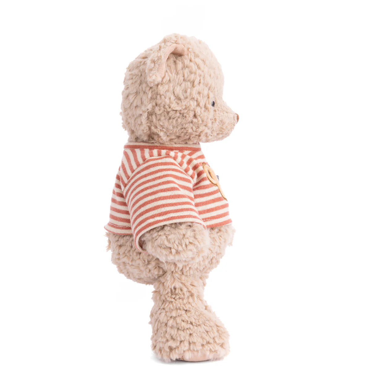 Colin is a soft, cuddly teddy bear with textured beige fur and a friendly stitched face. He wears a red-and-cream striped shirt featuring an embroidered bear face for an extra touch of charm. With his classic design and huggable feel, Colin is a delightful companion for playtime, snuggles, or display.