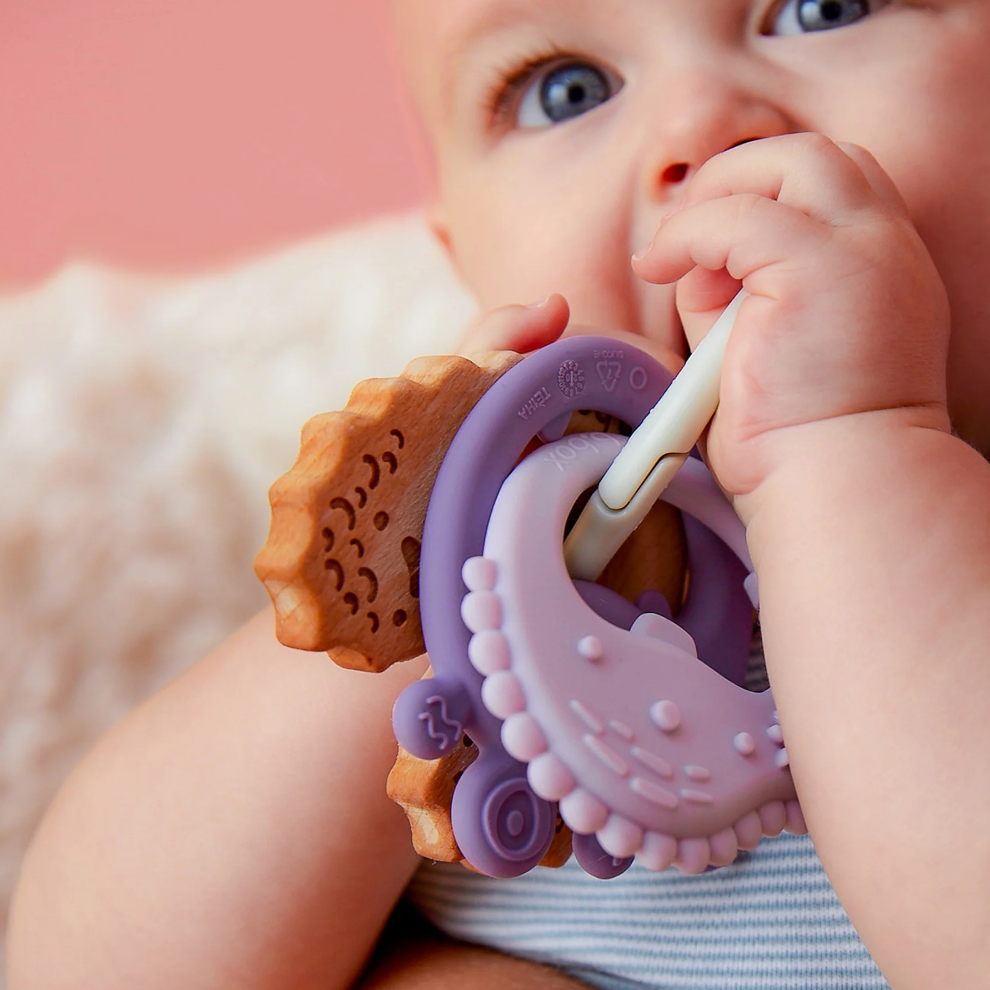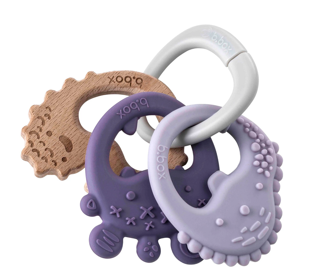 The trio teether is three textured teethers on one handy ring offering the choice of silicone and beechwood throughout the teething journey. Lightweight and easy to hold, use individually or as a set with customisable ring attachment to provide relief to sore, achy gums and stimulate sensory development. Suitable from 3 months and designed to grow with baby. Soft silicone ideal for early stages of teething, medium silicone features coarser textures and longer features to relieve the middle mouth and beechwood offers firm pressure with protruding features to comfortably reach the back of bubs mouth.