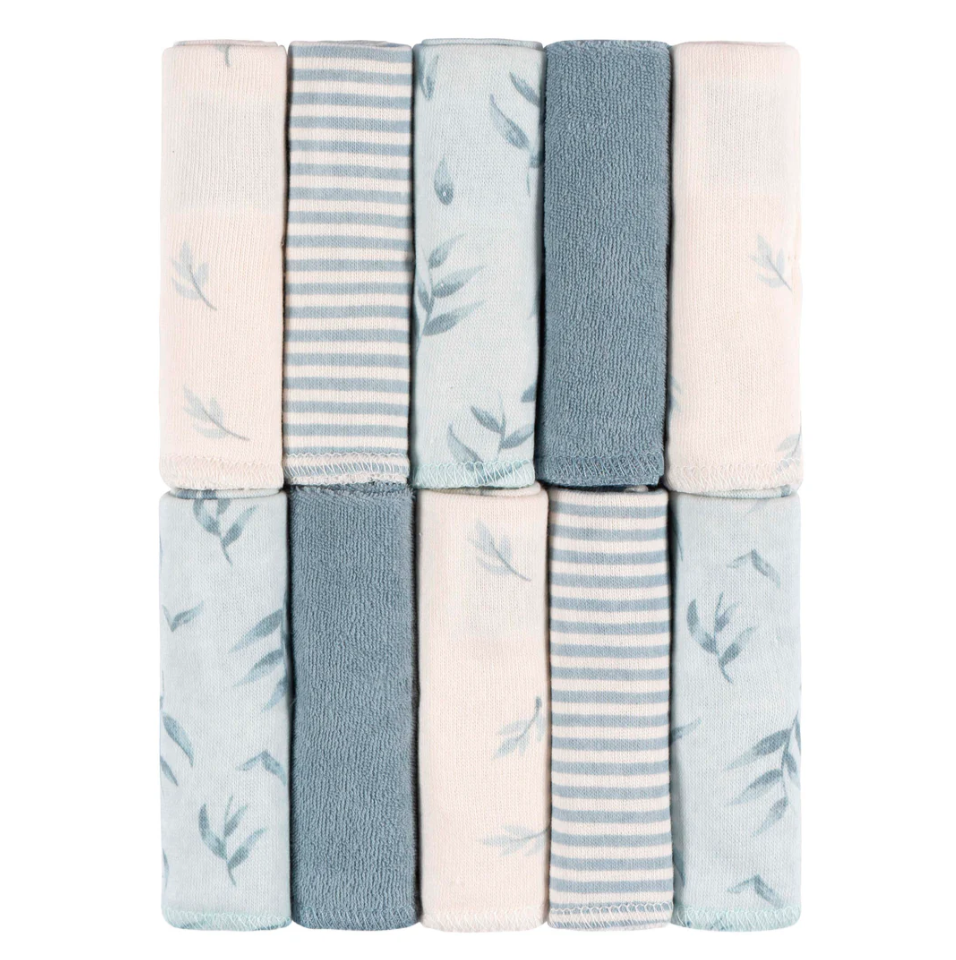 Keep your baby clean and happy with our 10-pack of baby washcloths. Made from soft cotton with plush, absorbent poly knit terry, these washcloths provide a soft touch for cleaning baby. Perfect for bathtime, they're also handy to keep in your diaper bag for quick cleanups on the go. Ensure your little one is always fresh and comfy with these essential washcloths!