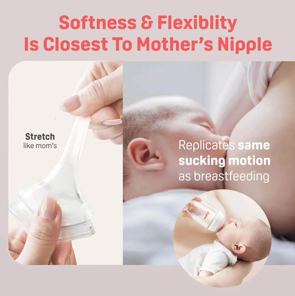 The Breastfeeding Experience bottle and nipple were developed with the goal of smooth use in combination with breastfeeding and allowing babies to drink with the same mouth movements as breastfeeding. It supports a baby's proper latch and smooth tongue movements, making breastfeeding a comfortable experience. Latch-On®: the wavy line on the nipple indicates how deep a baby should latch on. This line serves as a guide for moms and dads who are unsure how deep their baby should latch on. This Latch-On® guides babies to a proper latch and supports smooth breastfeeding. Latch-on refers to the moment a mother places her nipple in her baby's mouth just as the baby begins to latch on to the mother's nipple. Once latch-on is successful, your baby and you can start breastfeeding smoothly.
