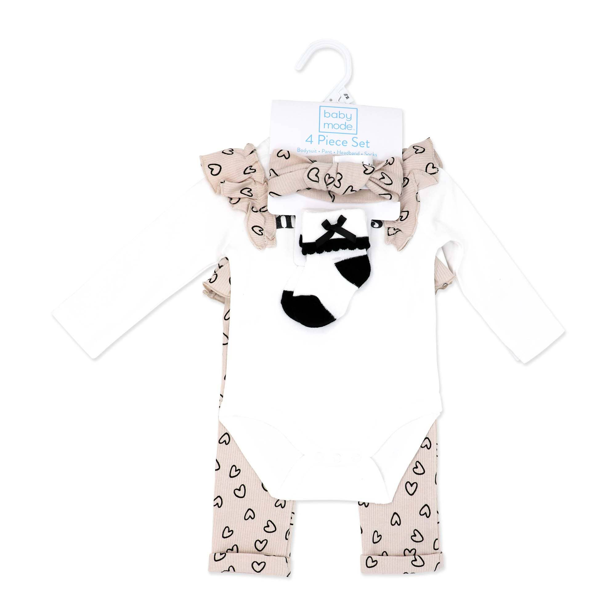 100% Cotton Set includes: Long Sleeve Bodysuit, Legging, Socks And Headband